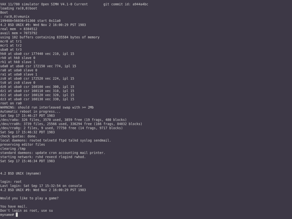 VAX 11/780 simulator Open SIMH V4.1-0 Current git commit id: a944a4bc loading ra(0,0)boot Boot : ra(0,0)vmunix 199488+56036+51360 start 0x11a0 4.2 BSD UNIX #9: Wed Nov 2 16:00:29 PST 1983 real mem = 8384512 avail mem = 7073792 using 102 buffers containing 835584 bytes of memory mcr0 at tr1 mcr1 at tr2 uba0 at tr3 hk0 at uba0 csr 177440 vec 210, ipl 15 rk0 at hk0 slave 0 rk1 at hk0 slave 1 uda0 at uba0 csr 172150 vec 774, ipl 15 ra0 at uda0 slave 0 ra1 at uda0 slave 1 zs0 at uba0 csr 172520 vec 224, ipl 15 ts0 at zs0 slave 0 dz0 at uba0 csr 160100 vec 300, ipl 15 dz1 at uba0 csr 160110 vec 310, ipl 15 dz2 at uba0 csr 160120 vec 320, ipl 15 dz3 at uba0 csr 160130 vec 330, ipl 15 root on ra0 WARNING: should run interleaved swap with >= 2Mb Automatic reboot in progress... Sat Sep 17 15:30:34 PDT 1983 /dev/ra0a: 326 files, 3569 used, 3860 free (20 frags, 480 blocks) /dev/rra0h: 3735 files, 25550 used, 336310 free (166 frags, 84036 blocks) /dev/rra0g: 2 files, 9 used, 77750 free (14 frags, 9717 blocks) Sat Sep 17 15:30:40 PDT 1983 check quotas: done. local daemons: routed telnetd ftpd talkd syslog sendmail. preserving editor files clearing /tmp standard daemons: update cron accounting mail printer. starting network: rshd rexecd rlogind rwhod. Sat Sep 17 15:30:42 PDT 1983 4.2 BSD UNIX (myname) login: